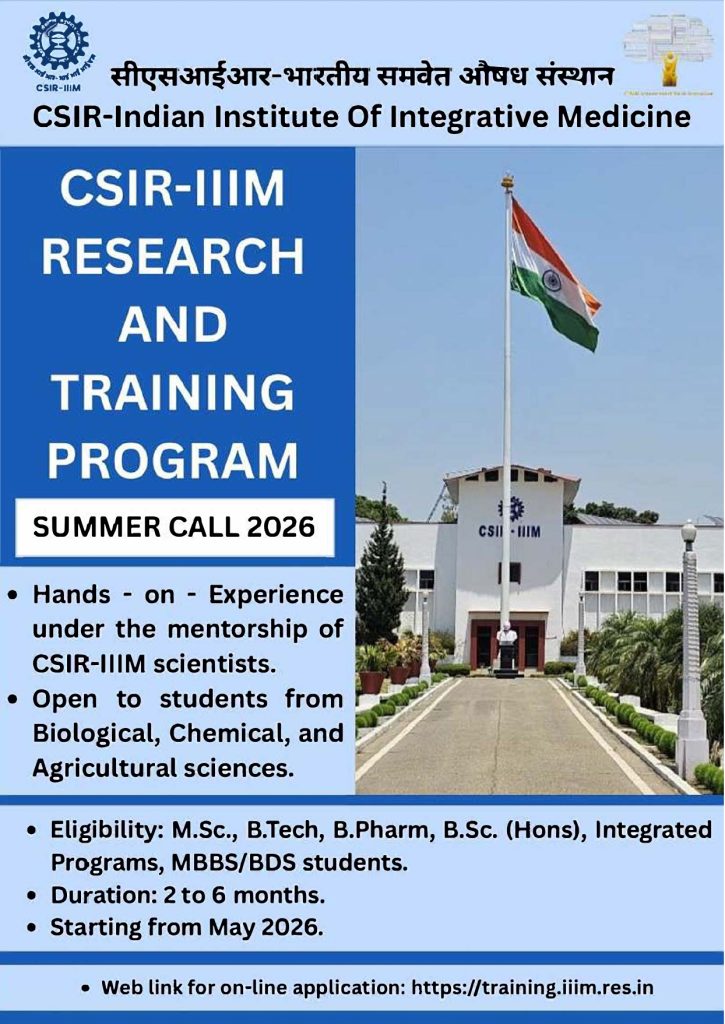 CSIR-IIIM invites online applications from prospective candidates of all branches of Biological, Chemical & Agricultural sciences for CSIR-IIIM Research & Training/Internship Program starting from May 2026 onwards.
