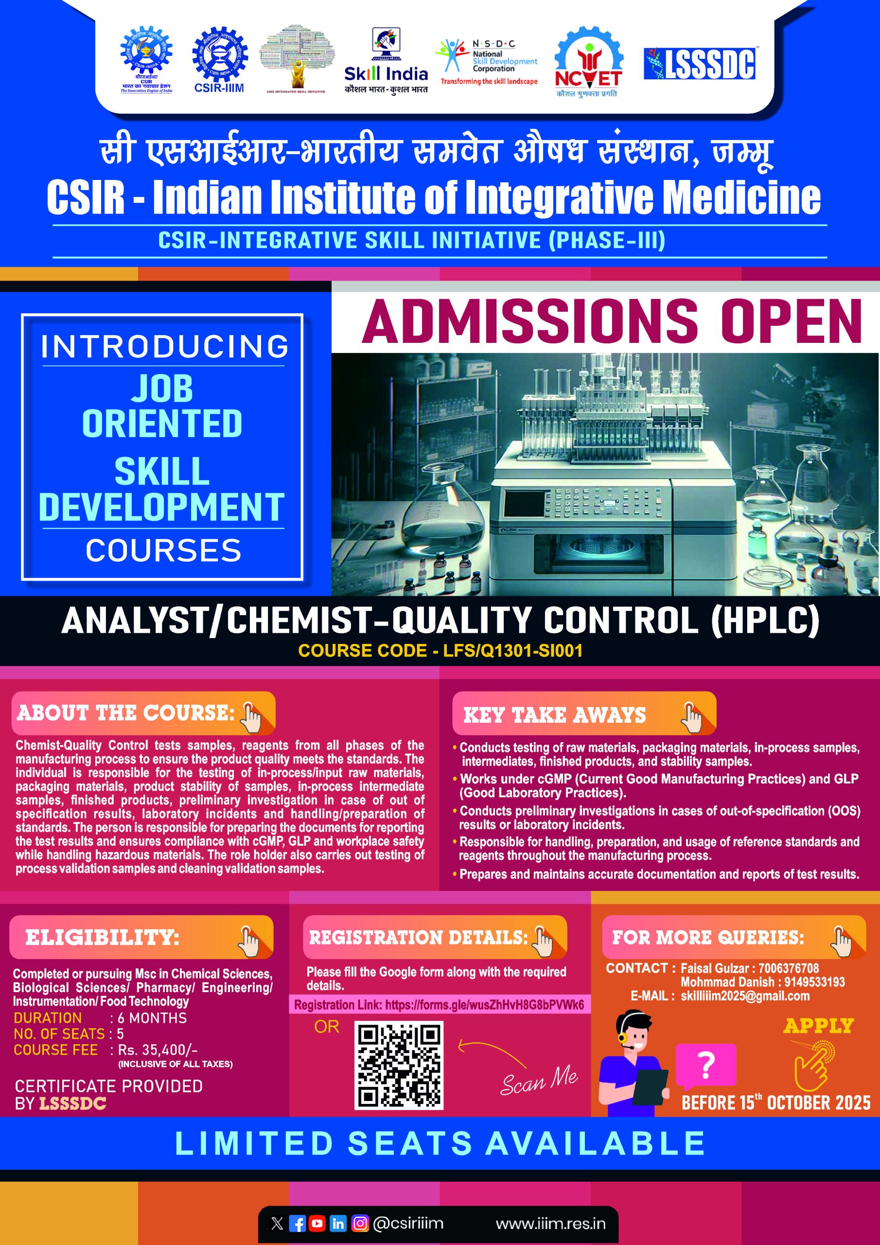 - ANALYST/CHEMISTQUALITY CONTROL (HPLC) [COURSE CODE – LFS/Q1301-SI001]