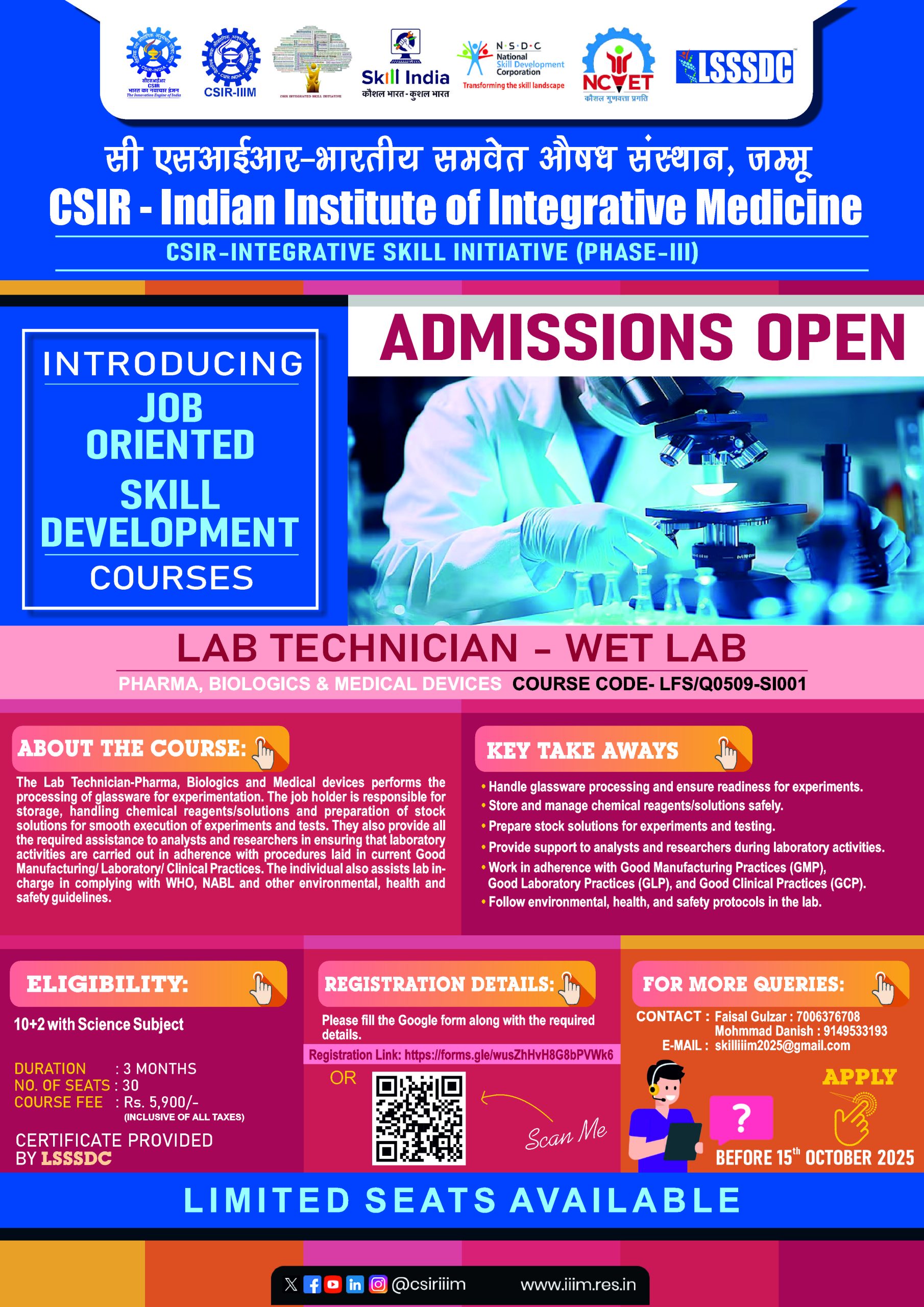 - LAB TECHNICIAN – WET LAB (PHARMA, BIOLOGICS & MEDICAL DEVICES) [COURSE CODE- LFS/Q0509-SI001]