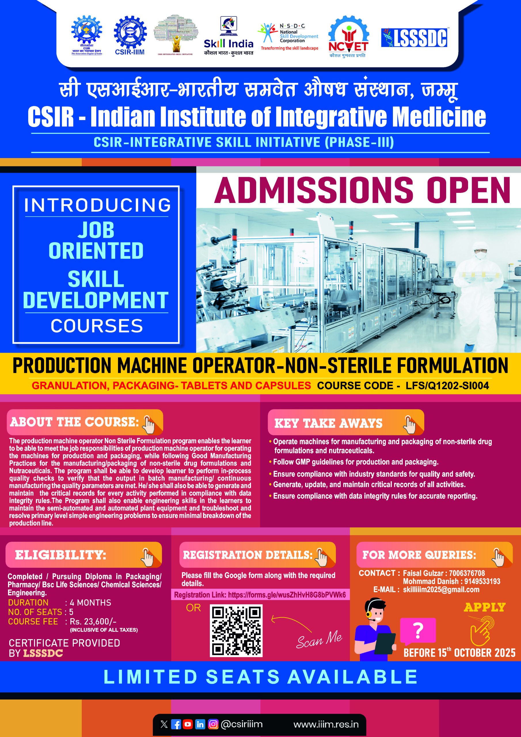 - PRODUCTION MACHINE OPERATORNON-STERILE FORMULATION (GRANULATION, PACKAGING – TABLETS & CAPSULES) [COURSE CODE – LFS/Q1202-SI004]